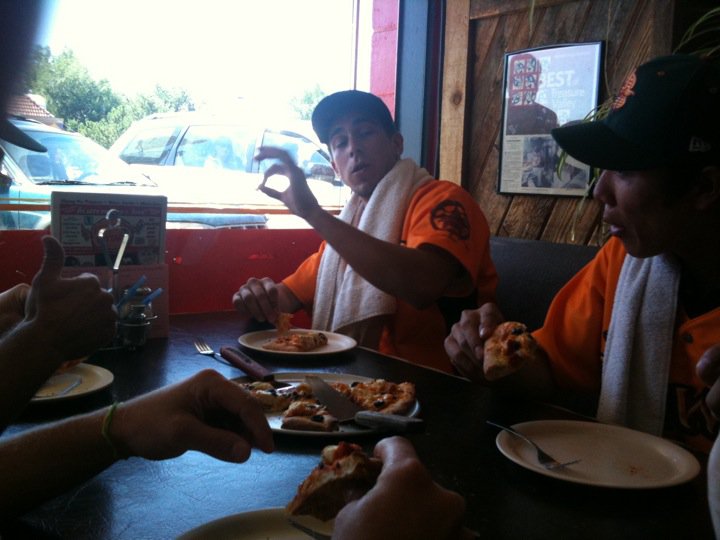 Our players took on the single habanero pizza and once you watch the video, you will see why. Veterans like Gibbs and LePage had no problem tangling with the beast; they pretty much made it look easy. Soto also downed his with little to no problem, but I haven’t seen him sweat like that since it was 95 degrees on game day. For Na, the habanero pizza was a bit of challenge. But he was able to pull it off and the four were able to finish an entire habanero pizza!