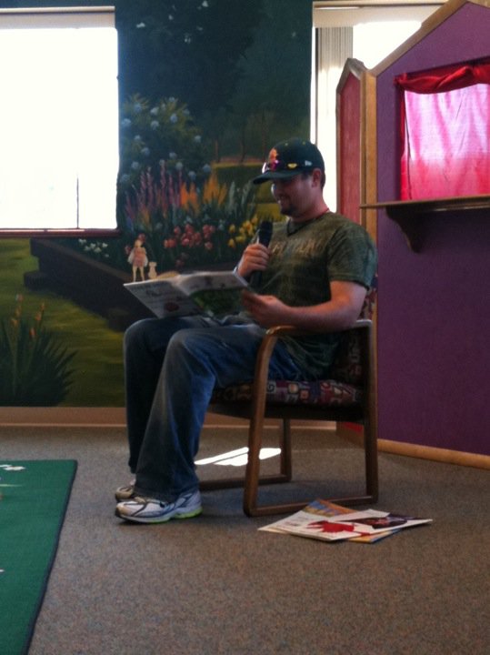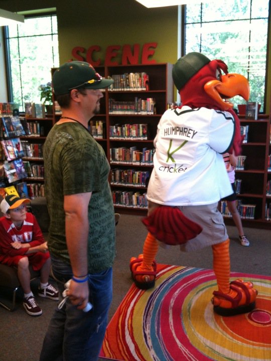 Hawks Pitcher John Mincone and local Boise legend Humphrey the Hawk, made an appearance at the Garden City Library yesterday. John read three stories to a plethora of young Hawks fans and Humphrey provided some entertainment, even challenging John to a game of Wii Baseball!